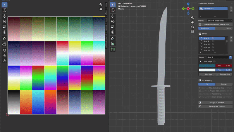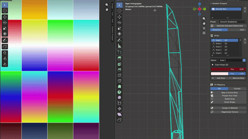 One-Click UV Mapping Select faces in Edit Mode and snap their UVs directly onto any palette strip — preserving gradient direction. No manual UV unwrapping needed.