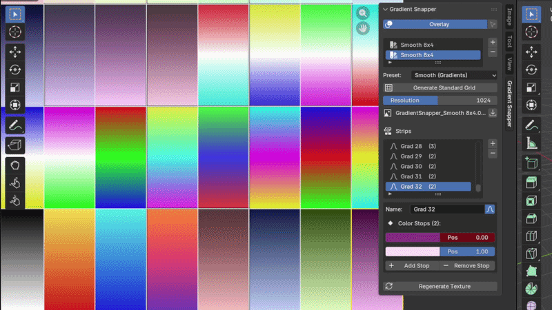 Interactive Stop Editor Open the Image Editor panel and click directly on your palette texture to select strips or drag color stop dots to reposition them in real time. The texture updates live as you drag.
