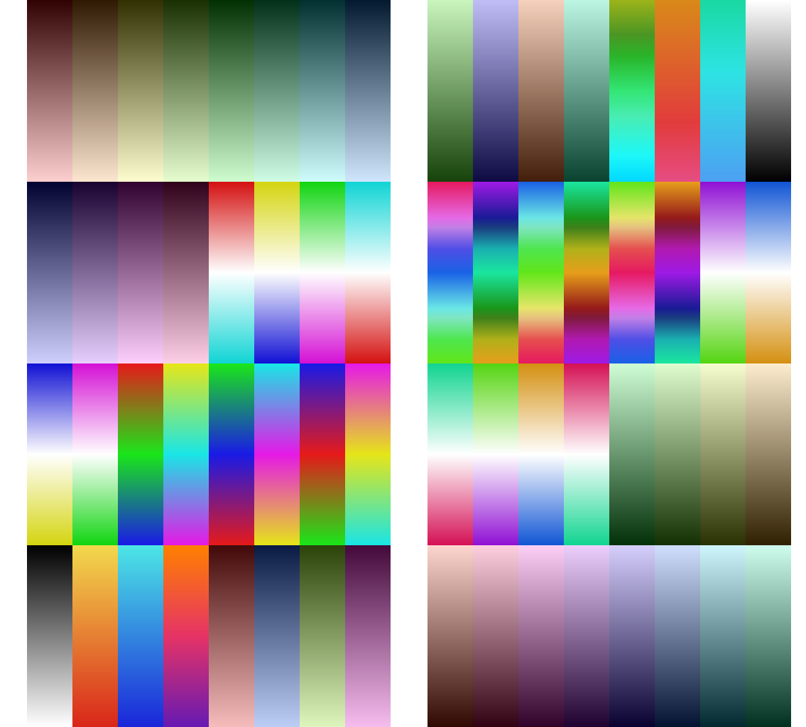 Generate Palette Textures Instantly bake your palette into a clean texture atlas with vertical gradients per strip. Cells are square, neatly organized in a fixed 8-column grid that grows automatically as you add strips. Resolution is fully adjustable (64 → 2048px).